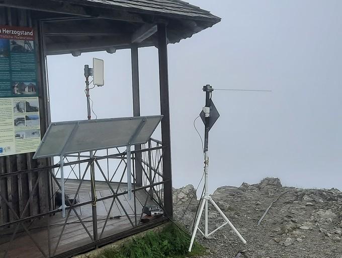Als Standort für den Contest hatten wir uns den Gipfel des Herzogstandes ausgesucht. In 1731 m Höhe hat man freie Sicht auf das Voralpenland, außerdem versprach die Hütte am Gipfel Schutz vor Regen. Unseren Funkplatz bauten wir im Inneren der Hütte auf, die Antennen und die wasserfeste HF-Einheit wurden außerhalb platziert.