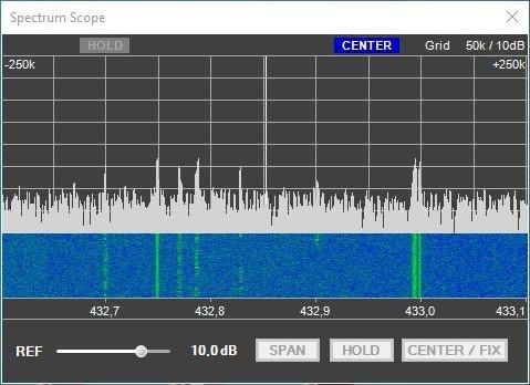 Klickt man nun in der Menüleiste auf “Scope” erscheint links vom Hauptfenster das Spektrum des gesamten empfangbaren Bereiches von 432,500 bis 433,000 MHz. Die Bandbreite der Anzeige kann mit einem Klick auf “SPAN” geändert werden.