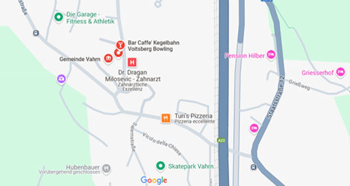 Genaue Anschrift des Versammlungssaales: Vahrn, Voitsbergstraße 1, Haus Voitsberg (siehe Karte und Bilder). Kleiner Versammlungssaal – siehe Pfeil im Bild. Links davon befindet sich das Gemeindeamt Vahrn, rechts die Bar Voitsberg.