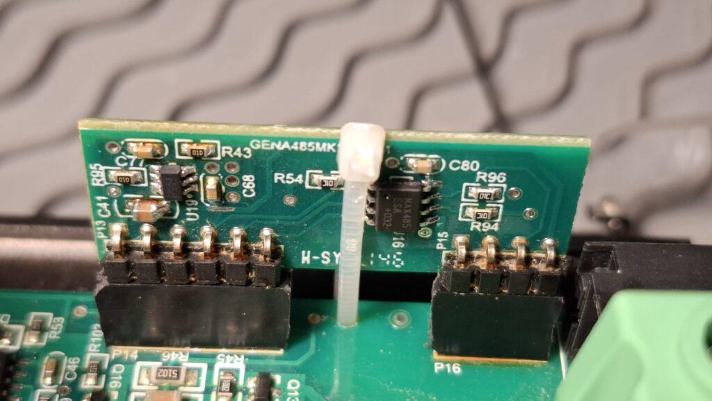 Um das Bauteil besser auflöten zu können, habe ich die gesamte Platine samt Pin-Header ausgelötet und dafür zwei Steckbuchsen eingelötet. So kann beim nächsten Mal die Reparatur leichter von statten gehen. Zur mechanischen Sicherung wurde noch ein Kabelbinder angebracht.