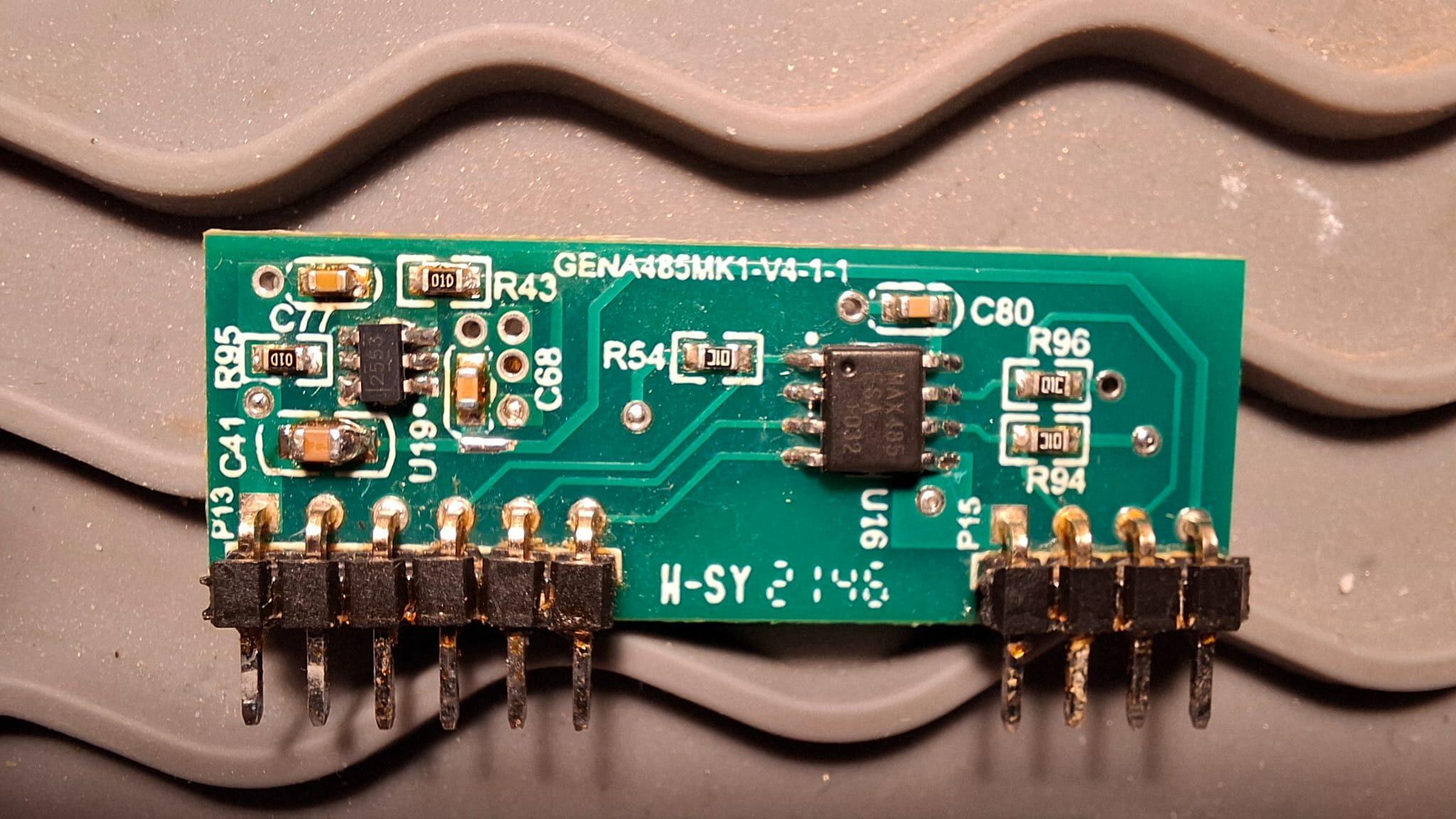 Der Austausch auf der Zusatzplatine des RS485 Bausteines brachte keinen Erfolg. Trotzdem war keine Kommunikation herzustellen. Nach Prüfung der + 5 V Spannung an der RS485 Buchse wurde festgestellt, dass diese fehlte (Pin ganz rechts vom 4er Pinheader).