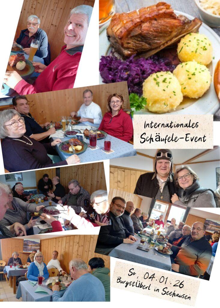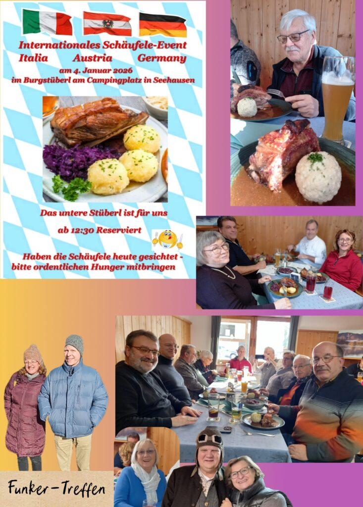 Und schließlich noch etwas Neues: Wisst ihr eigentlich, was ein „Schäufele“ ist? Unsere Mitglieder Christian DL1MCG und Angelika DG2MBY hatten uns mit dieser Frage konfrontiert und waren bemüht, unsere Bildungslücke zu schließen. Am Sonntag, 04.01.25 sind Thomas IW3AMQ mit seiner XYL, Herbert IW3BRH und Rita IN3IJZ einer Einladung zum Frühschoppen vom OV C03 (Ortsverband Zone Garmisch) im Burgstüberl am Staffelsee/ Seehausen gefolgt und dem Geheimnis auf die Spur gekommen: ein besonderes Gericht mit knuspriger Schweinsschulter, Kartoffel- oder Semmelknödel und Rotkraut. Sehr lecker und etwas Besonderes! Es fand sich eine nette, länderübergreifende Funkerrunde, teils mit Partnerin ein – 17 Teilnehmer:innen! Ein herzliches Dankeschön für die Einladung und den anregenden Austausch! Der DRC hat auch zwei neue Mitglieder dazugewonnen: Herbert DG7MCC und Achim DK5WW – herzlich willkommen!