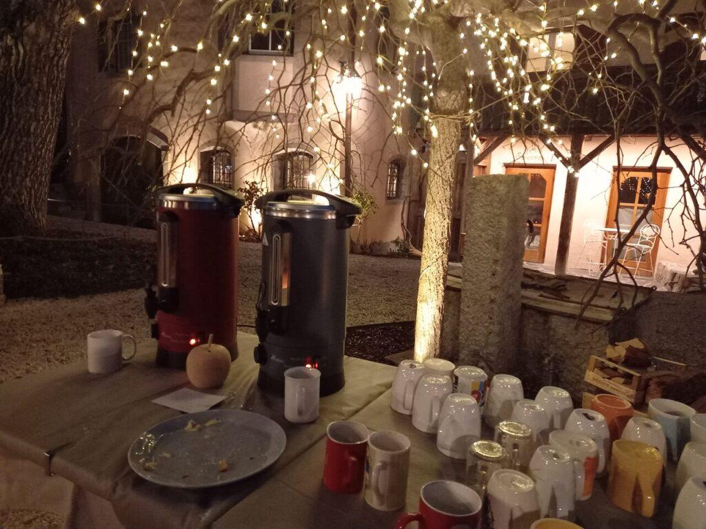 Abschließend wurde am Vorhof ein kleines Feuer entzündet und unter Sternenhimmel und Weihnachtsbeleuchtung zum Glühwein und Apfelglühfix eingeladen. So klang unsere Weihnachtsfeier gegen 17.00 Uhr in sehr gemütlicher Runde aus.