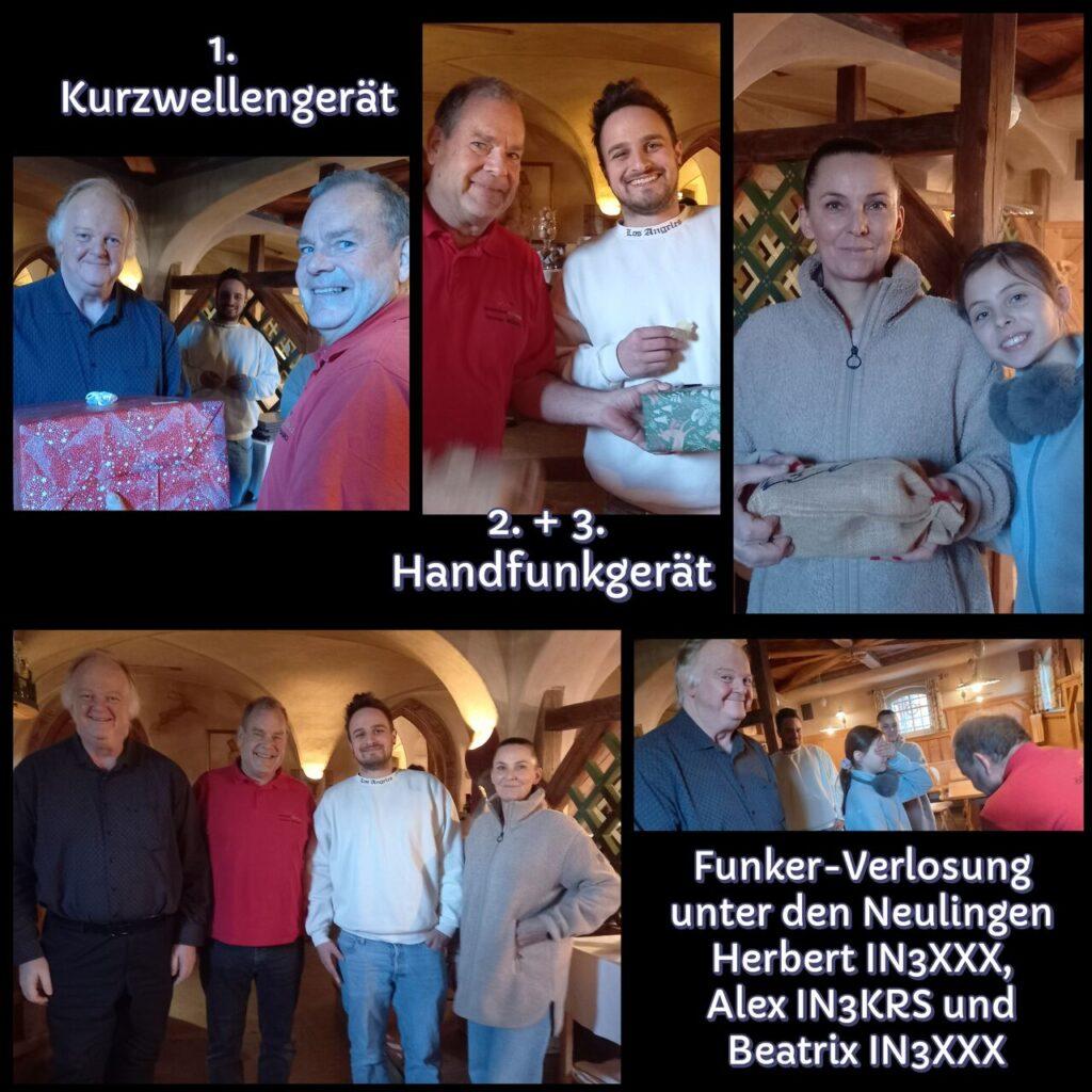 Einen besonderen Höhepunkt bildete heuer die Verlosung von drei gebrauchten Funkgeräten unter unseren „Funk-Neulingen“. Dabei spielte Zivi die gute Fee, zählte zwischen den drei anwesenden Neulingen die Reihenfolge aus und zog dann die Preise: Unser Präsident Thomas IW3AMQ überreichte Herbert IN3XXX ein Kurzwellengerät, Beatrix IN3XXX und Alex IN3KRS gewannen ein Handfunkgerät. Wir gratulieren, auch zur bestandenen Amateurfunkprüfung! P.S.: die XXX in den Rufzeichen warten auf die baldige Zuweisung des richtigen Rufzeichens durch das Ministerium!
