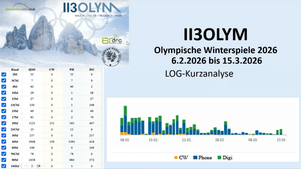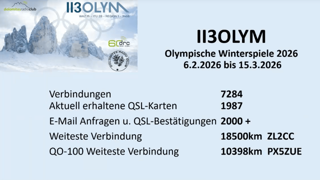 Mit dem Sonderrufzeichen II3OLYM ist dem Dolomites Radio Club (DRC) anlässlich der Olympischen und Paralympischen Winterspiele Milano Cortina 2026 ein bemerkenswertes internationales Amateurfunkprojekt gelungen. Vom 6. Februar bis 15. März 2026 war die Sonderstation parallel zu den olympischen und paralympischen Wettkämpfen auf den Amateurfunkbändern aktiv und sorgte weltweit für Aufmerksamkeit.