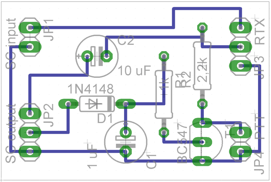 Bei einigen Geräten wird die PTT über einen 2,2 kOhm Widerstand direkt auf das TX-NF Signal gelegt, wie im Schaltplan gezeichnet. Bei getrennter PTT-Steuerung, den 2,2 kOhm Widerstand R2 weg lassen und PTT direkt an JP4 anschließen.