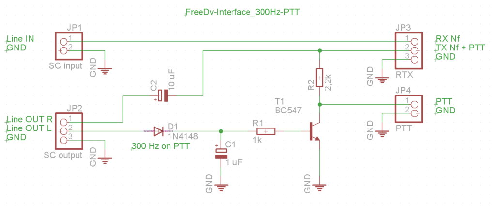 Wer die Möglichkeit der PTT-Tastung über den linken TX-Audiokanal mit 300 Hz nutzen möchte, weil z.B. kein RS232 Port zur Verfügung steht oder ein zusätzlicher Kabel stört, kann sich ein einfaches Interface mit diesem Schaltbild selbst nachbauen.