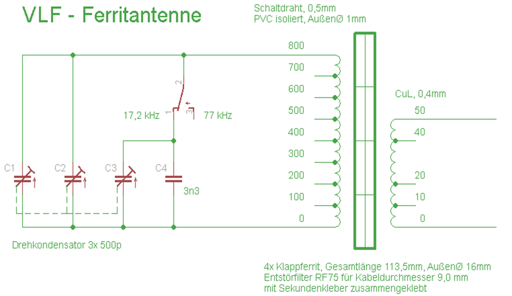 Hallo, bei der vorgeschlagenen Ferritantenne muss unbedingt mit einem Generator und einer simplen Ankoppelspule auf 17,2 kHz mal ein Resonanztest gemacht werden. Nur bestimmte Ferrite sind für VLF brauchbar.